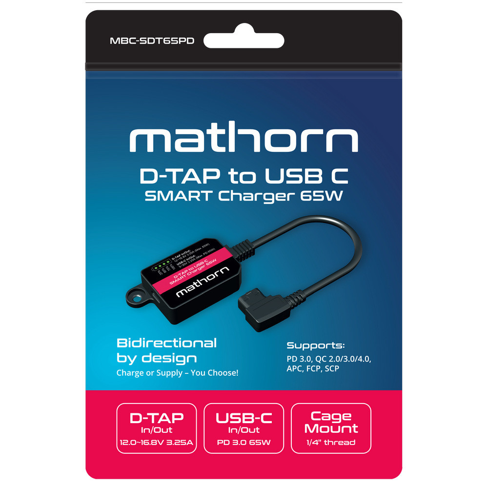 Mathorn MBC-SDT65PD to wielofunkcyjny, dwukierunkowy adapter ładujący D-TAP na USB-C, który umożliwia ładowanie baterii ze złączem D-TAP za pomocą opcjonalnej ładowarki USB, a także zasilanie innych urządzeń wyposażonych w wejście D-TAP. Dodatkowo, w połączeniu z baterią V-mount z D-TAP, adapter może pełnić funkcję powerbanku o dużej pojemności z portem USB-C PD 65W. Jedno niewielkie urządzenie, które otwiera zupełnie nowe możliwości pracy fotografa i filmowca, zarówno w terenie, jak i w studiu.