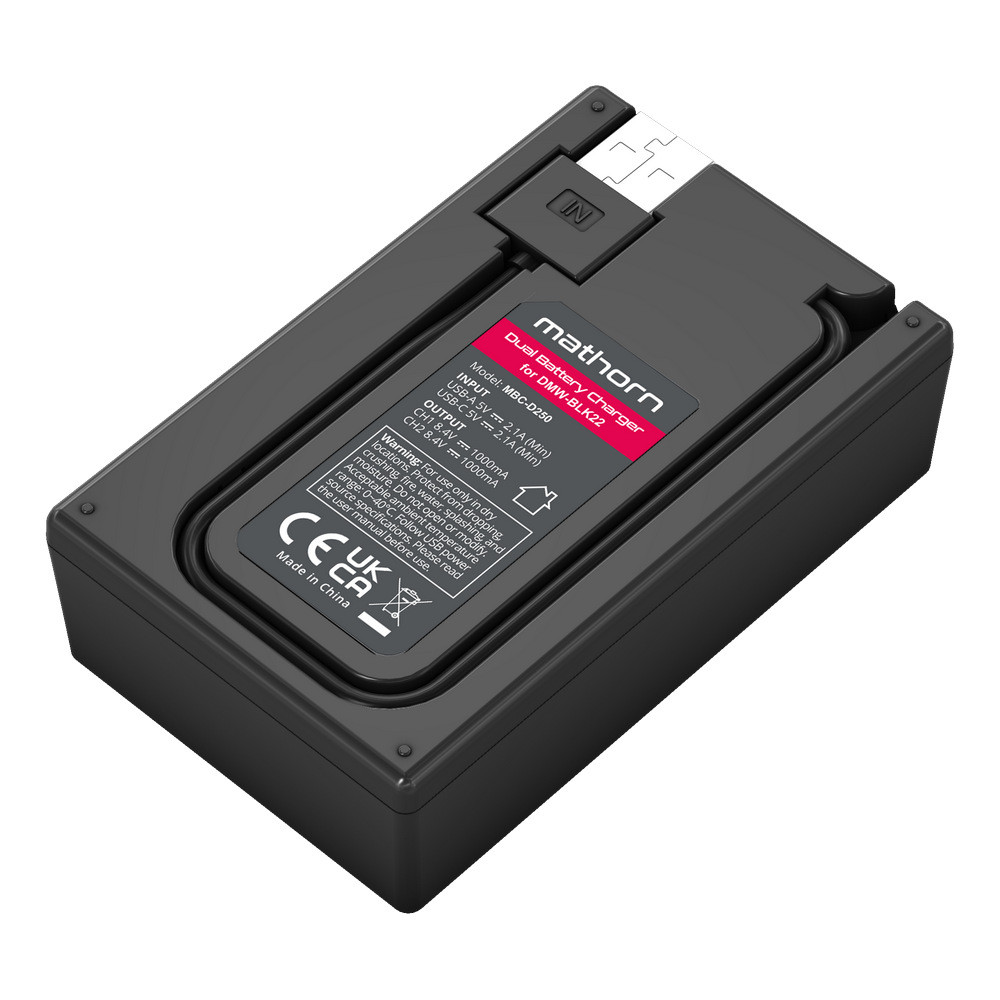Mathorn MBC-D250 to szybka dwukanałowa ładowarka przeznaczona do ładowania baterii Panasonic DMW-BLK22 oraz jej zamienników. Wyposażona jest podświetlany, monochromatyczny wyświetlacz LCD, który dostarcza kluczowe informacje o procesie ładowania, takie jak: napięcie, prąd ładowania, ilość dostarczonego ładunku czy graficzne przedstawienie poziomu naładowania baterii. Co ciekawe, ładowarka oferuje możliwość szybkiego sprawdzenia stanu naładowania baterii, nawet gdy nie jest podłączona do źródła zasilania USB. Wbudowany kabel USB typu A oraz dodatkowe gniazdo USB-C zapewniają swobodę użytkowania w domu i w podróży, pozwalając ładować baterię za pomocą powerbanku, portu USB w samochodzie czy nawet z laptopa.