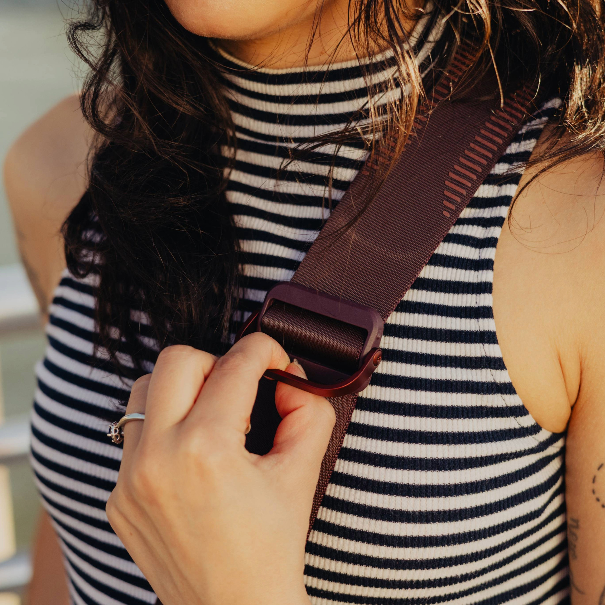 Slide możesz nosić na ramieniu, na szyi lub przez plecy. Silikonowe elementy na jednej stronie paska zapewniają, że nie zsuwa się on z ramienia, a gładka strona ułatwia przesuwanie paska po ubraniu, zapewniając wygodę przy noszeniu na szyi. Szybka regulacja długości za pomocą aluminiowych uchwytów umożliwia wygodne przełożenie paska przez ramię lub noszenie go jak torby typu Sling.