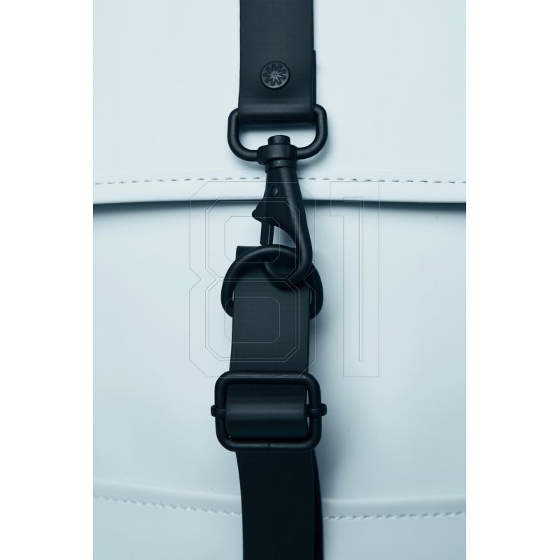 - Sylwetka plecaka to klasyk Rains, charakteryzujący się wystającą klapą i centralnym paskiem z zapięciem na karabińczyk.